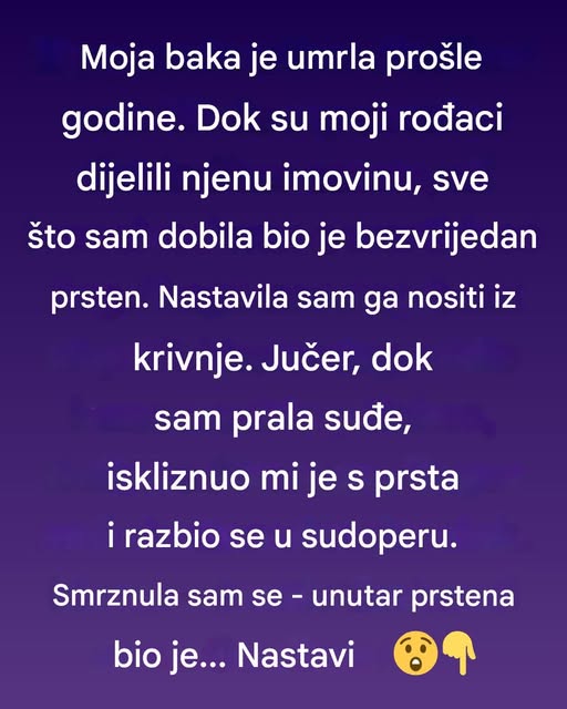 Međutim, kada sam pažljivo ispitala prsten, primetila sam nešto neobično. Unutar šupljeg obruča bila je mala poruka. Drhtavim rukama izvukla sam papir i razotkrila ono što će zauvek promeniti moj pogled na prsten. Na papiriću je pisalo: „Ti si bila jedina koja je dolazila. Prsten je pripadao tvom dedi. Kamen je dijamant od dva karata. Namerno sam učinila da izgleda bezvredno, da ti ga niko ne bi oduzeo. S ljubavlju, zauvek.“