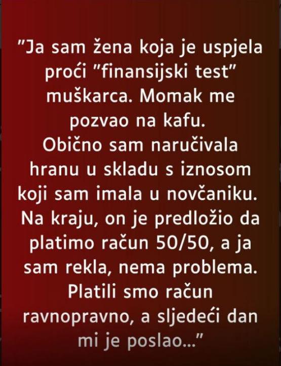 Već narednog dana uslijedilo je iznenađenje. Muškarac joj je poslao buket cvijeća uz poruku da je prva žena koja je bez ikakvog prigovora prihvatila princip „pola-pola“. Taj gest nije bio samo romantičan, već i priznanje da ravnoteža u odnosima počinje od sitnica. Situacija je otvorila širu raspravu o modernim vezama, očekivanjima i nepisanim pravilima koja ljudi često nameću jedni drugima.