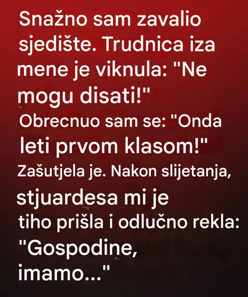 Bio sam iscrpljen nakon naporne sedmice i jedina želja bila mi je da se smjestim, zatvorim oči i makar nakratko odmorim. Avion je bio pun, prostor skučen, a umor je preuzeo kontrolu nad mojim strpljenjem. U tom stanju, čuo sam tihi glas iza sebe koji je rekao da ima problema s disanjem. Umjesto razumijevanja, reagovao sam kratko i grubo, stavljajući vlastitu udobnost ispred tuđe potrebe. U tom trenutku nisam zastao da razmislim, nisam postavio pitanje, nisam pokazao brigu.