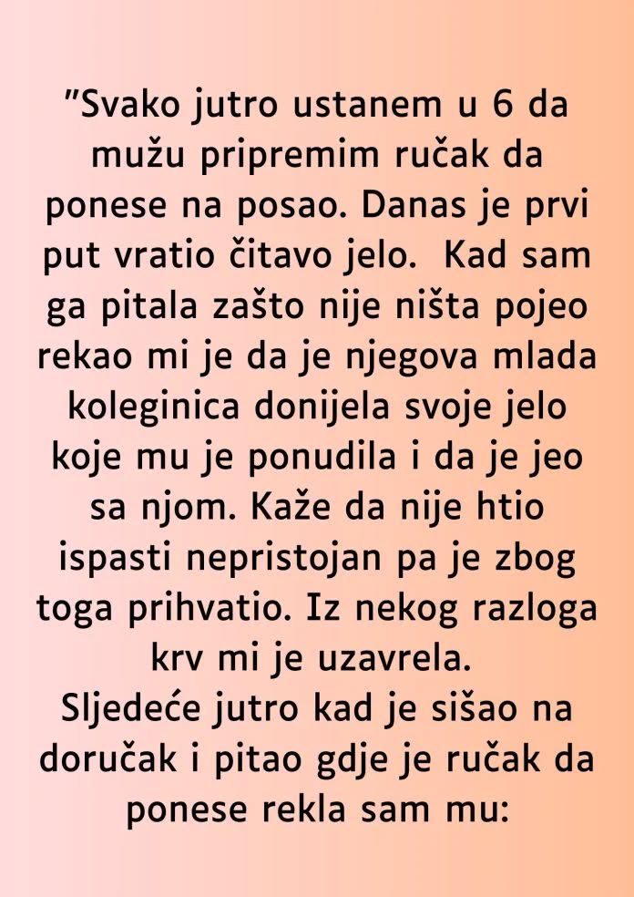 Sljedećeg jutra, dok je pripremala doručak, u njoj je još uvijek tinjalo ono isto pitanje – da li je pretjerala ili je konačno vidjela ono što je dugo ignorisala. Kada je muž sišao i upitao gdje mu je ručak, osjetila je kako joj se srce steže.