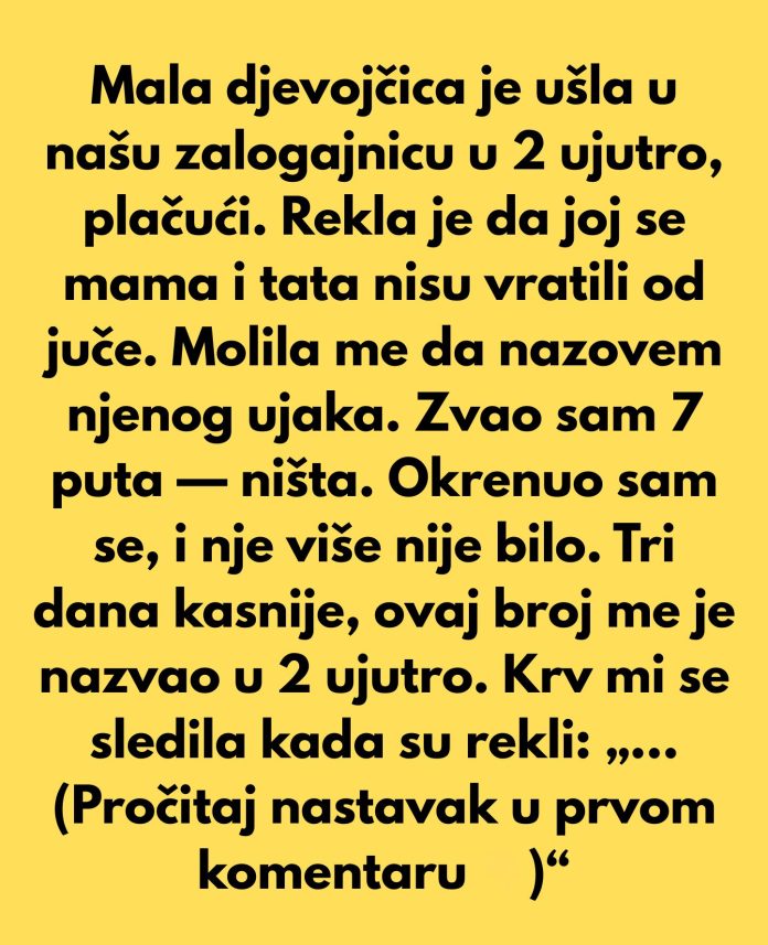 Tri dana kasnije, ženi je stigla poruka koja je u potpunosti promijenila njen pogled na cijelu situaciju. Djevojčica je bila sigurna, smještena kod svog ujaka, dok su joj roditelji bili hospitalizirani nakon teške saobraćajne nesreće. I dok je djevojčica slala fotografiju sa smiješkom na licu, poruka je sadržavala još nešto – nešto što je duboko dirnulo ženu koja joj je pomogla.