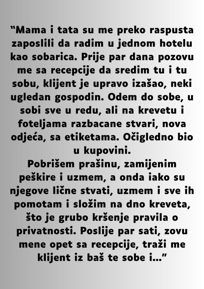 Jednog dana dobila je poziv s recepcije da ode i pospremi sobu gosta koji je upravo napustio hotel. Naizgled rutinski zadatak pretvorio se u iskustvo koje će dugo pamtiti.