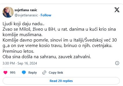 Objavu je podijelila žena iz Miloševog kraja, željeći da održi uspomenu na čovjeka čije je djelo prevazišlo sve podjele koje je rat donio. U jednostavnim rečenicama, ona je prenijela nevjerojatnu priču o njegovom herojskom činu — o tome kako je u najtežim vremenima pružio utočište djetetu svog komšije, muslimana, riskirajući sve. Ovaj čin ljudskosti postaje još značajniji kada se uzme u obzir kontekst u kojem se dogodio: rat u Bosni i Hercegovini, koji je razorio zajednice, porodice i prijateljstva, čineći granice između “naših” i “njihovih” oštrim kao nož.