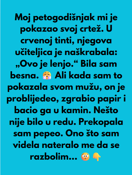 Poruka na poleđini crteža, napisana rukopisom njenog muža, otkriva šokantnu istinu o njegovim izvanbračnim vezama i obmanama. To nije bila samo poruka namijenjena djetetu, već jasna prijetnja upućena njoj. Shvatila je da su svi ti “kasni izlasci” i “telefonski pozivi zbog posla” zapravo bili laži, da je njen muž bio u vezi s nekim drugim, a ta osoba sada koristi njenog sina kao kanal za prijetnje i manipulaciju.