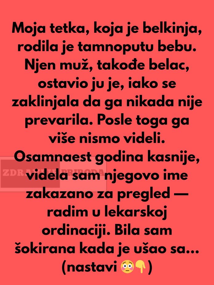Osamnaest godina kasnije, radila sam u jednoj ordinaciji i bila šokirana kada sam ugledala njegovo ime na zakazanom listiću za pregled. Čovek koji je pre toliko godina napustio moju tetku i njihovog sina sada je stajao pred mojim očima. Došao je sa ženom i sinom, koji je, na moje iznenađenje, bio tamnoput. Iako sam bila potpuno zbunjena, nisam mogla da ne proverim njegove podatke. Kada sam pogledala njegov karton, shvatila sam da su zaista bili njegova supruga i sin. I tada je sve postalo jasno.