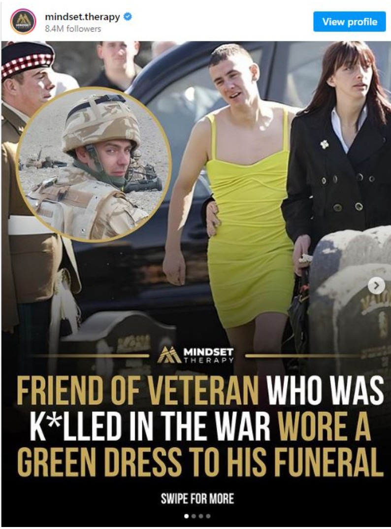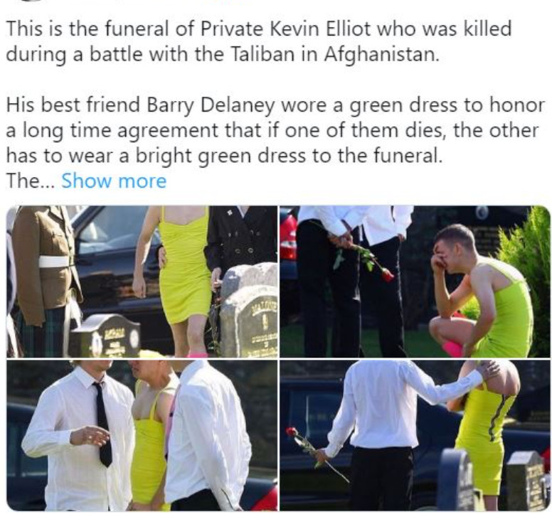 - Kevin Elliott izgubio je život u Afganistanu, što je duboko pogodilo njegovog prijatelja Barryja. Prije nego je Kevin otišao na bojište, on i Barry su sklopili dogovor, koji na prvi pogled može izgledati kao šala, ali je bio pun značaja. Dogovor je bio jednostavan, ali duboko emotivan: ako Kevin pogine, Barry će nositi žensku haljinu na njegovom sprovodu. Iako se činilo da je to samo humoristični dogovor, on je zapravo predstavljao izražavanje dubokog prijateljstva i spremnosti da se suoče s neizvjesnošću rata i životom.