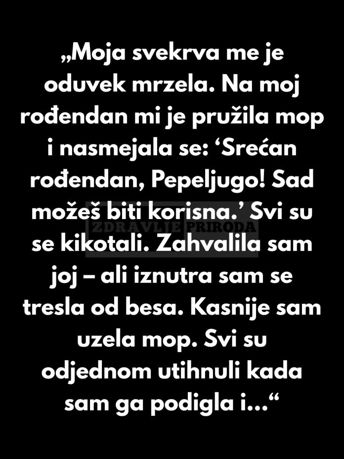 Nakon nekoliko trenutaka prestala je brisati pod. Pogledala je svekrvu pravo u oči i izgovorila rečenicu koja je promijenila atmosferu u prostoriji. Rekla je da želi da joj svekrva objasni šalu, jer bi i ona voljela da se smije.