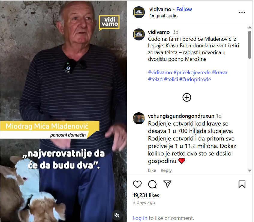 Porodica Mladenović, kao odgovorni stočari, nikada nisu očekivali da će njihova krava Beba doneti na svet četiri zdrava teleta. Uobičajeno je da se u takvim situacijama rađaju jedno ili eventualno dva teleta, pa je iznenađenje bilo ogromno. Kada je Beba počela da pokazuje neobične simptome, Miodrag Mladenović, domaćin, pomislio je da bi možda mogla roditi blizance. Međutim, stvarnost je bila mnogo neobičnija. Četiri potpuno zdrava teleta su na svet došla iznenadivši sve prisutne. Teletima su dali imena: Deki, Sanela, Kasandra i Boki, što je dodatno obogatilo ovu predivnu priču.