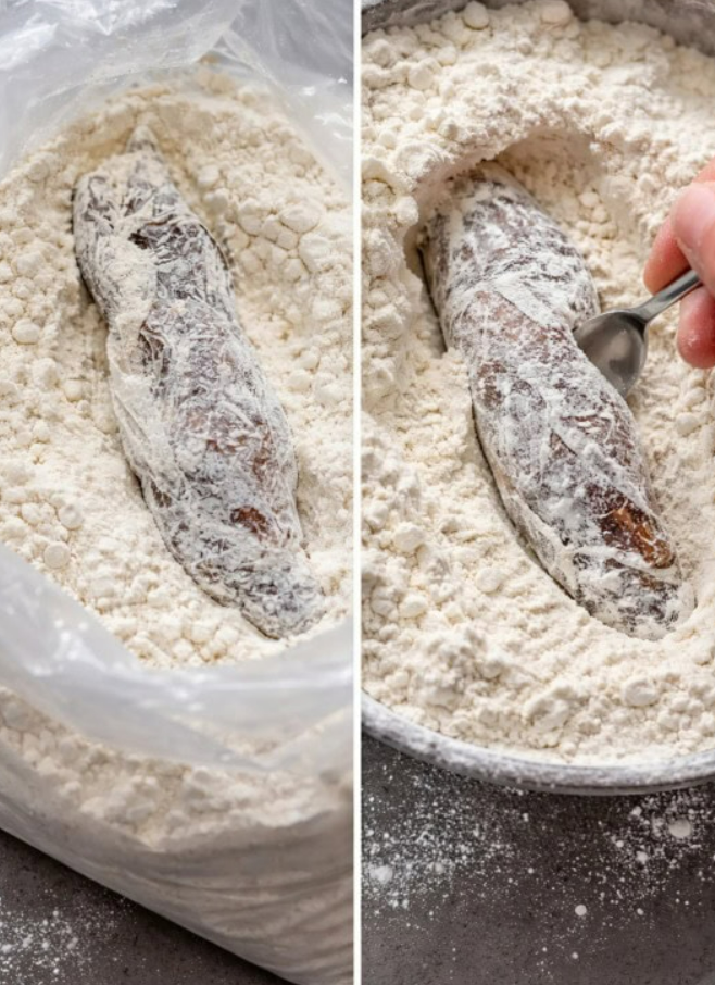 - Ubrzo je u rukama držala nešto izduženo, prekriveno slojem brašna, gotovo kao da je bilo skriveno.