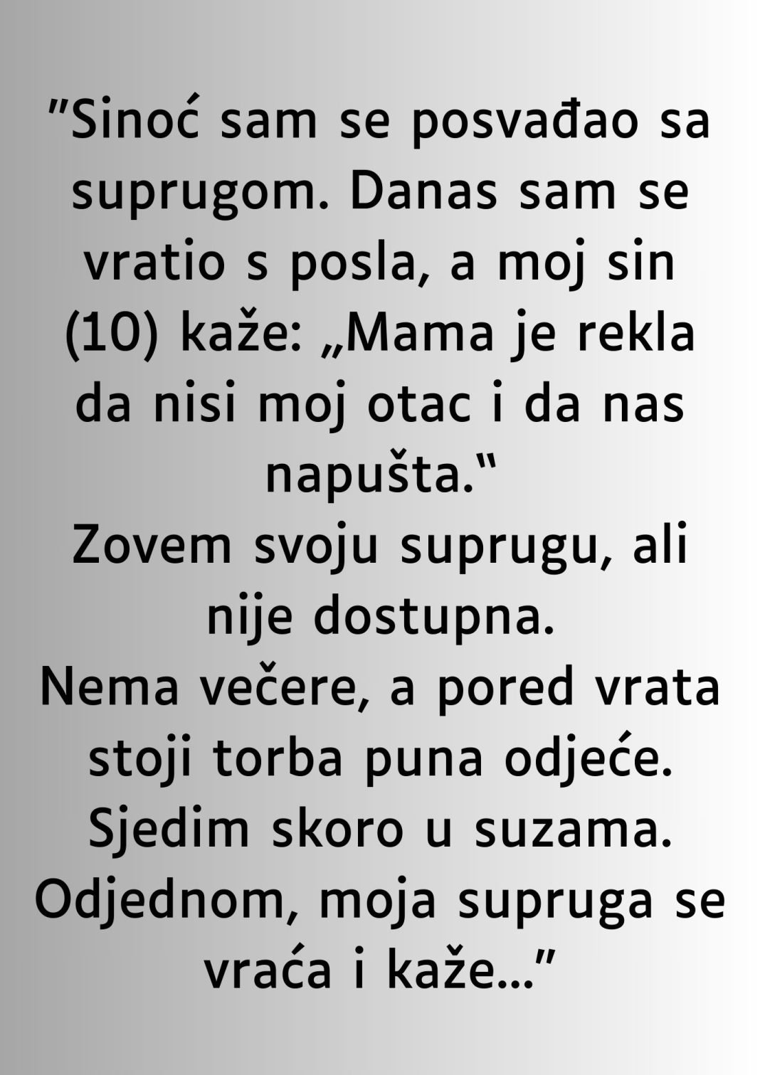 Dok je dan prolazio, suprug je bio uvjeren da će se situacija smiriti, kao što je to obično bivalo nakon svake svađe. Međutim, dočekalo ga je iznenađenje koje nije mogao zamisliti. Njegov sin, desetogodišnjak, stajao je ispred firme, blijed i uplašen, s očima punim suza. Njegove riječi su bile poput oštrice: „Mama je rekla da nisi moj tata… i da nas napušta.“ Ove riječi su ga pogodile kao grom iz vedra neba, ostavljajući ga bez daha. U tom trenutku, spoznao je koliko su daleko otišli od onoga što su nekada bili. Ovaj strah njegovog djeteta od gubitka obitelji potaknuo je duboko preispitivanje vlastitih postupaka i osjećaja.