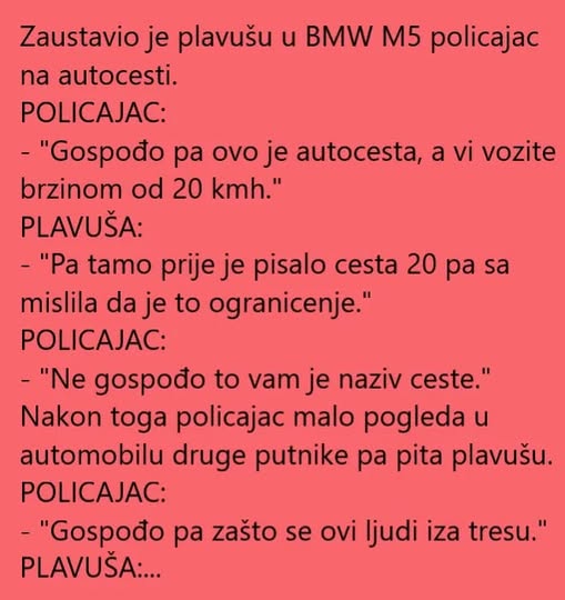 Dok se ona trudila da izbegne još jedan prekomerni razgovor, policajac je bio siguran da je ona pod velikim stresom i da su je na brzinu pripremili za iznenadni važan posao. „Pa, nisam znala, ali sada kad ste mi rekli, sigurno ću ubrzati… Samo ne znam hoću li stići do kraja ceste prije nego što se promijeni naziv!” rekla je plavuša, dajući policajcu razlog da uzdahne i pomisli: “Ovo je zaista jedan od onih dana…”