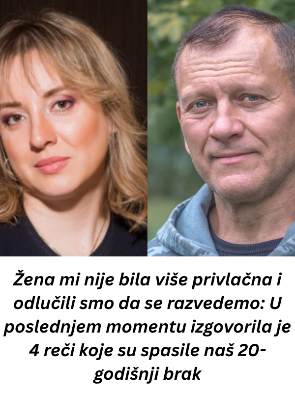 Ovo je priča o paru koji je bio na ivici razvoda, ali su četiri jednostavne reči promenile sve i spasile njihov dvadesetogodišnji brak. Kako se ljubav može povratiti i prevazići godine rastuće udaljenosti i nesigurnosti, pokazuje upravo ova iskrena ispovest. Daša i njen muž su nakon 20 godina zajedničkog života stajali na ivici kraja. Umorni od svakodnevnih problema i tihe emocionalne distance koja ih je postepeno udaljavala, njihov brak je postao samo formalnost. Djeca su već osetila da se njihovi roditelji udaljavaju, a svaki pokušaj da poprave situaciju padao je u vodu. On je bio ubeđen da je sve gotovo, da su prošle godine pokušaja, a ništa više nije moglo da spasi njihov odnos. Međutim, kako to obično biva u životu, ponekad je baš tada najbliže mogućem rešenju.